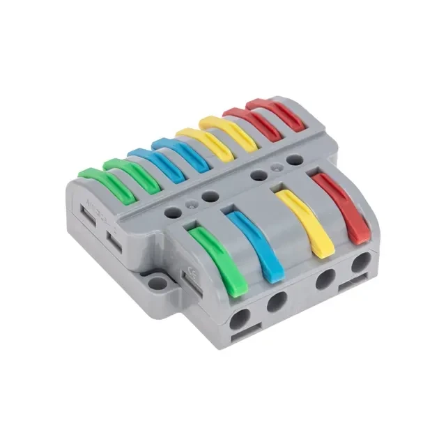 Многоразовые проходные разветвительные клеммы REXANT предназначены для соединения медных одножильных и многожильных зачищенных проводников. Состоит из 4 изолированных полюсов. Применяется для разделения связки из 4 пар проводов на 2 направления. Контакт осуществляется путем зажима проводника пластиной. Конструкция предотвращает случайное размыкание контакта. Специальное технологическое отверстие на корпусе клеммы предназначено для проверки соединения тестером-пробником или щупом мультиметра. Для удобства использования разные фазы клеммы имеют уникальную цветовую разметку. Характеристики: Материал: Полиамид 66 Количество полюсов: 4 Количество вводов: 12 Материал контактов: луженая медь Зажим: сталь Цвет: серый Напряжение: 450 В Типы подключаемых проводов: одножильные, многожильные Ток: для одножильных проводов — 32 А, для многожильных проводов — 24 А Поддерживаемое сечение: 2x0.14-4 мм² (одножильный провод), 2x0.2-2,5 мм² (многожильный провод) Рабочая температура: –40...+85 °C Длина зачистки изоляции: 10 мм