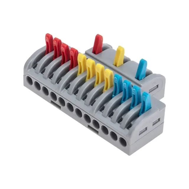 Многоразовые проходные разветвительные клеммы REXANT предназначены для соединения медных одножильных и многожильных зачищенных проводников. Состоит из 3 изолированных полюсов. Применяется для разделения 3-х жильного проводов на 4 направления. Контакт осуществляется путем зажима проводника пластиной. Конструкция предотвращает случайное размыкание контакта. Специальное технологическое отверстие на корпусе клеммы предназначено для проверки соединения тестером-пробником или щупом мультиметра. Для удобства использования разные фазы клеммы имеют уникальную цветовую разметку. Характеристики: Материал: Полиамид 66 Количество полюсов: 3 Количество вводов: 15 Материал контактов: луженая медь Зажим: сталь Цвет: серый Напряжение: 450 В Типы подключаемых проводов: одножильные, многожильные Ток: для одножильных проводов — 32 А, для многожильных проводов — 24 А Поддерживаемое сечение: 2x0.14-4 мм² (одножильный провод), 2x0.2-2,5 мм² (многожильный провод) Рабочая температура: –40...+85 °C Длина зачистки изоляции: 10 мм