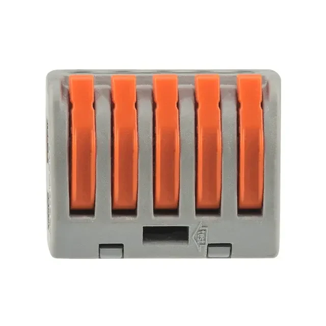Соединительная многоразовая клемма REXANT на 5 проводников с плоско-пружинным зажимом предназначена для подсоединения медных одножильных и многожильных зачищенных проводников тонкого сечения. Перед монтажом с соединяемых проводников необходимо снять изоляцию в соответствии с обозначениями на корпусе клеммы (9-12 мм). Зачищенный участок с монтажной стороны не должен иметь сильных изгибов. Вставьте его в свободное гнездо клеммы, предварительно подняв оранжевый рычажок, после этого опустите рычажок в исходное положение. Контакт осуществляется путем зажима проводника пластиной. Конструкция предотвращает случайное размыкание контакта. Специальное технологическое отверстие на корпусе клеммы предназначено для проверки соединения тестером-пробником или щупом мультиметра. Корпус из пластика делает контакт изолированным. Извлечение проводника (демонтаж) осуществляется действиями в обратном порядке. Характеристики: Размер: 26,6x14.5x20.5 мм Материал: Полиамид 66 Количество контактов: 5 Материал контактов: луженая медь Зажим: сталь Цвет: серый Напряжение: 400 В Материал подключаемых проводов: Cu Типы подключаемых проводов: одножильные, многожильные Ток: для одножильных проводов — 32 А, для многожильных проводов — 24 А\28-12 AWG Поддерживаемое сечение: 5x0.2-4 мм² (одножильный провод), 5x0.14-2.5 мм² (многожильный провод) Рабочая температура: –40...+85 ºC