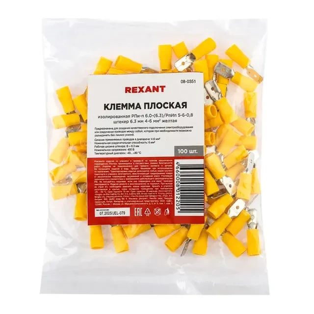 Клемма плоская изолированная РПи-п 6.0-(6.3)/РпИп 5-6-0,8 штекер 6.3 мм 4-6 мм? желтая REXANT