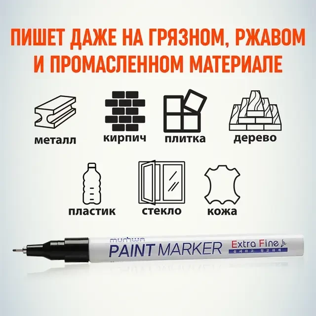 Водостойкий маркер-краска MunHwa «Extra Fine Paint Marker» лаковый на нитро-основе. Используется для маркировки изделий из: пластика, дерева, металла, камня, кирпича, стекла, резины, кожи. Применяется при реставрации, декорировании, ремонте и строительстве. Лаковый маркер не смазывается, не разбрызгивается и не растекается при нанесении благодаря клапанному механизму пишущего узла. Чернила поступают дозированно, ровно ложатся на поверхность. Перед использованием необходимо встряхнуть маркер и в вертикальном положении надавить стержнем на поверхность: дать краске пропитать пишущий узел. Игольчатая форма наконечника не оставляет царапин при письме. Чернила обладают свето-, влаго- и термостойкостью, высыхают на поверхности в течение 40-60 секунд. Корпус выполнен из прочного алюминия.