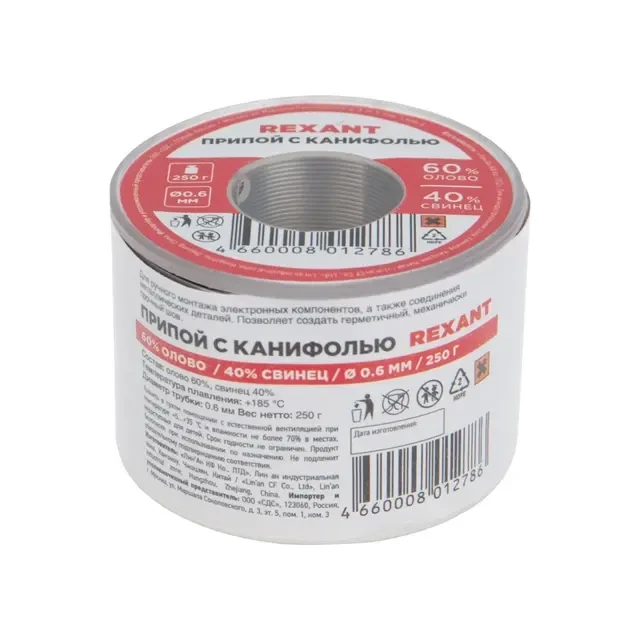 Припой с канифолью REXANT представляет собой проволоку (диаметром 0,6 мм) из сплава олова (60 %) и свинца (40 %). Используется в пайке для соединения деталей между собой и позволяет создать герметичный, механически прочный (устойчивый) шов. Нагреваясь до температуры плавления (183...188 °C) припой: расплавляется, смачивает спаиваемый металл и, растекаясь по нему — заполняет место между соединяемыми деталями. В свою очередь флюс канифольный активный (MC-20A) помогает сделать паянное соединение более прочным! Убирая окислительную плёнку со спаиваемых поверхностей и защищая их от дальнейшего окисления при пайке. Содержание флюса в припое — 2,2 %. Как видно из вышесказанного припой с канифолью REXANT — самое что ни на есть «два в одном»: припой и флюс на катушках по 250 грамм.