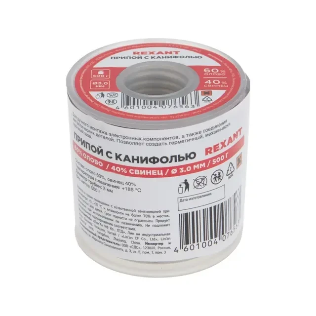 Припой с канифолью REXANT представляет собой проволоку (диаметром 3,0 мм) из сплава олова (60 %) и свинца (40 %). Используется в пайке для соединения деталей между собой и позволяет создать герметичный, механически прочный (устойчивый) шов. Нагреваясь до температуры плавления (183...188 °C) припой: расплавляется, смачивает спаиваемый металл и, растекаясь по нему — заполняет место между соединяемыми деталями.