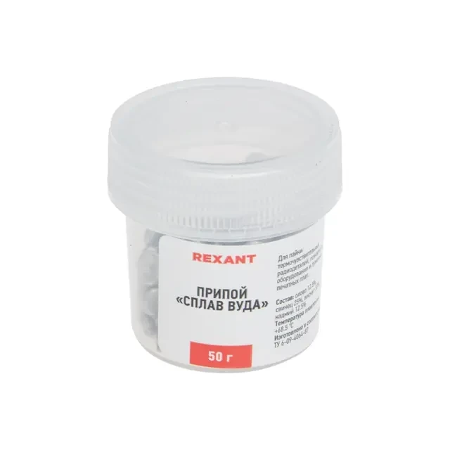 Сплав ВУДА REXANT - гранулы 50 г применяется в радиотехнической промышленности и других отраслях, как легкопайкий припой (сплав).Температура плавления +68 °C. Представляет собой небольшие гранулы серебристого цвета. Преимущества сплава Вуда: Одна из самых низких температур плавления, которая ниже ста градусов Цельсия, что позволяет применять для чувствительных к температуре деталей. Является незаменимым для многих сфер. Доступный сплав, который имеет широкое распространение. Основные характеристики: Состав: олово 12.5%, свинец 25%, Висмут 50%, Кадмий 12.5% Температура плавления: +68,5°C Изготовлено в соответствии с ТУ 6-09-4064-87. Меры предосторожности: Не допускать попадания на кожу (может вызвать аллергию). Хранить в плотно упакованной таре. Работать в хорошо проветриваемых/вентилируемых помещениях, в соответствующих средствах личной защиты.