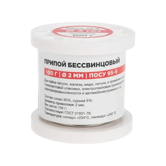 Припой ПОСу 95-5 представляет собой композицию из 95% олова и 5% сурьмы (Sn95Sb5, оловянно-сурьмянистый припой). Подходит для пайки латуни, железа, меди, латуни. Применяется для абразивной пайки и пайки тонколистовой упаковки. Используется в электроламповом производстве, электропромышленности и автомобилестроении и т.д. Активно применяется при пайке трубопроводов, работающих при повышенных температурах, а также при пайке силовых электронных плат, в схемах которых имеются электронные детали увеличенной мощности. Вариант фасовки – катушка с проволокой диаметром 2 мм. Температура плавления: солидус +234°C, ликвидус +240°C. Изготовлен в соответствии с требованиями ГОСТ 21930-76. Отсутствие свинца в составе припоя исключает появление вредных испарений на рабочем месте.