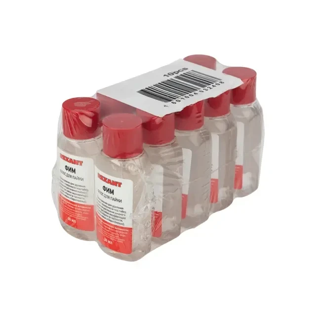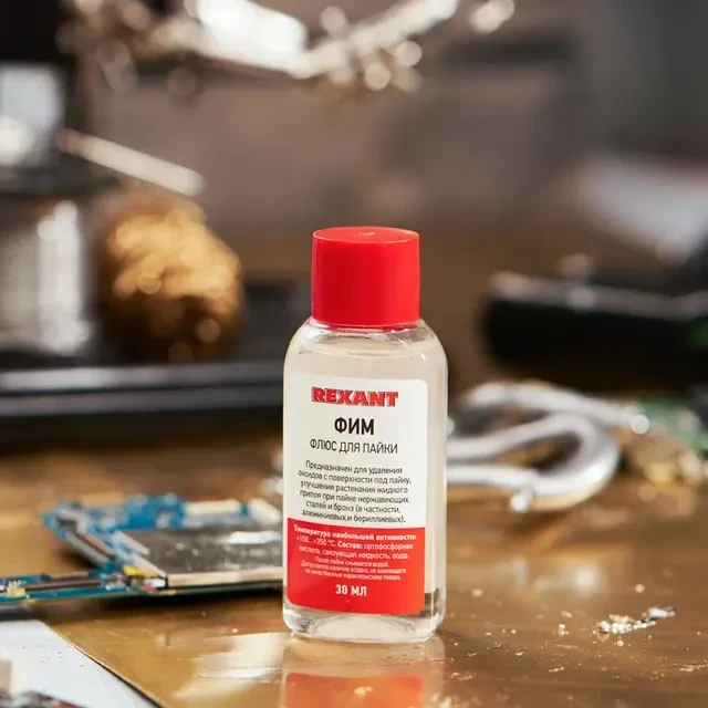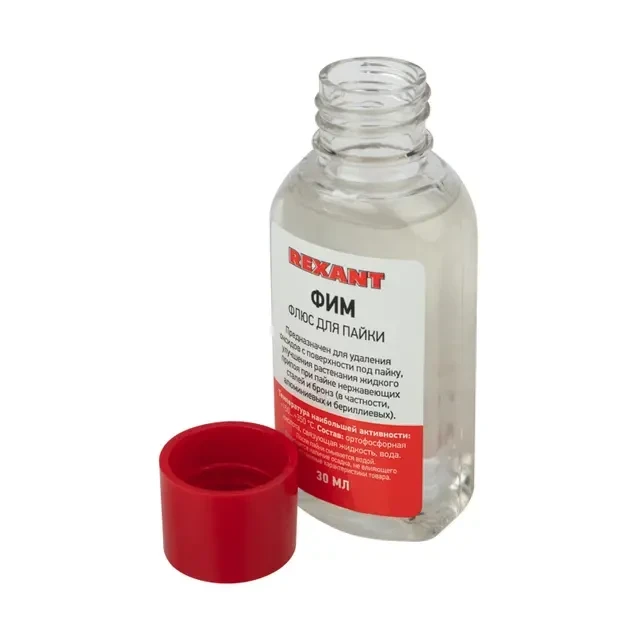 Флюс ФИМ REXANT предназначен для удаления оксидов с поверхности под пайку и улучшения растекания жидкого припоя при пайке нержавеющих сталей, никеля, меди и бронз (в частности, алюминиевых и бериллиевых), константа и черных металлов. Изготовлен бесканифольный флюс на основе ортофосфорной кислоты. После пайки необходимо смыть остатки соединения водой. В процессе хранения допускается выделение незначительного количества осадков, не влияющих на качественные характеристики флюса. Температура наибольшей активности: +150...+350℃. Основные компоненты: ортофосфорная кислота, связующая жидкость, вода. Вариант фасовки – флакон объемом 30 мл.