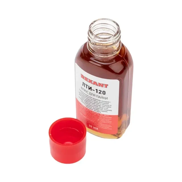 Флюс ЛТИ-120 REXANT предназначен для удаления оксидов с поверхности под пайку, улучшения растекания жидкого припоя и защиты нержавеющих сплавов, меди и ее сплавов, оцинкованных изделий, нихрома, свинца, никеля, серебра, кадмия, палладия, висмута от воздействия окружающей среды. Изготовлен в соответствии с ТУ 84-406-73. Данный низкотемпературный флюс применяется при пайке и лужении деталей в радиоэлектронике. После пайки смывка не требуется: остатки флюса послужат защитным покрытием мест пайки. При необходимости растворяется спиртом или ацетоном. Преимущества: не проводит ток, поэтому широко применяется при пайке печатных плат и радиоаппаратуры; не требует отмывки после пайки; повышает прочность соединений. Температура наибольшей активности: +200...+300°С. Состав: канифоль сосновая, связующая жидкость, триэтаноламин, диэтиламин гидрохлорид. Вариант фасовки – флакон 30 мл.