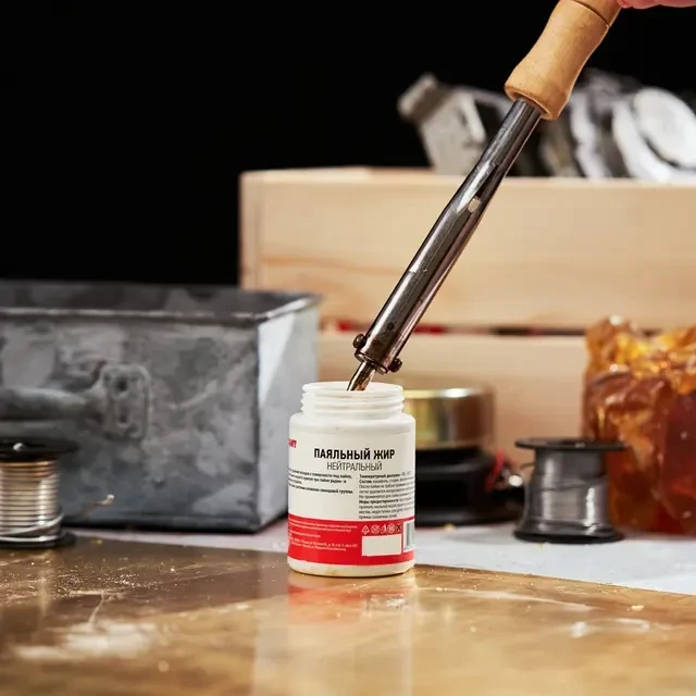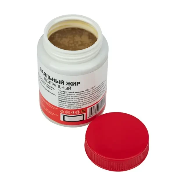 Нейтральный паяльный жир предназначен для удаления оксидов с поверхности под пайку, улучшения растекания жидкого припоя при пайке радио- и электротехнических устройств. Преимущественно используется для пайки токопроводящих деталей телефонной, радио- и электронной аппаратуры. Не применяется для пайки алюминия и его сплавов. Изготовлен в соответствии с ГОСТ 19250-73. Флюс хорошо держится на различных металлических контактах, обеспечивая точное дозирование и высокую скорость нанесения на большое количество мест. Ускоряет процесс лужения контактов, медленно испаряется на жале паяльника, не оставляя нагара. После пайки смывка не требуется. При необходимости остатки удаляются спиртовыми и высокоочищенными бензиновыми растворами или специальными промывочными жидкостями. Температура наибольшей активности: +180…+300°С. Состав: канифоль, стеарин и пластификатор. Вариант фасовки – банка 100 мл.
