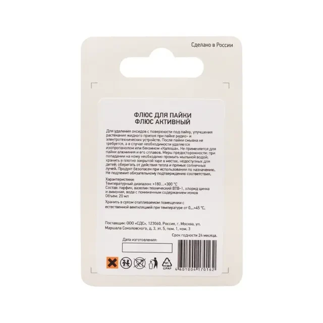 Активный паяльный жир предназначен для удаления оксидов с поверхности под пайку, улучшения растекания жидкого припоя при пайке сильно окисленных деталей, черных и цветных металлов, углеродистых сталей, меди и никеля. Используется для замены паяльной кислоты. Не применяется для пайки алюминия, его сплавов и электротехнической аппаратуры! Изготовлен в соответствии с ГОСТ 19250-73. Хорошо держится на металлических контактах, обеспечивая точное дозирование и высокую скорость нанесения. Ускоряет процесс лужения контактов, медленно испаряется на жале, не оставляя нагара. Остатки флюса удаляются спиртовыми растворами или смывочными жидкостями. Температура наибольшей активности: +150…+350°С. Состав: вазелин технический (ВТВ-1), парафин, хлорид цинка, хлорид аммония и вода деионизованная. Фасовка – банка 20 мл. Флюс с таким же составом выпускают известные фирмы: Stannol, Felder, CHEMET, ERSA, GOOT.