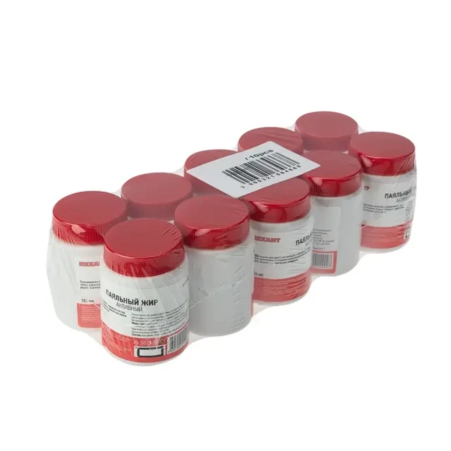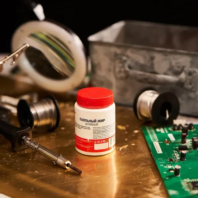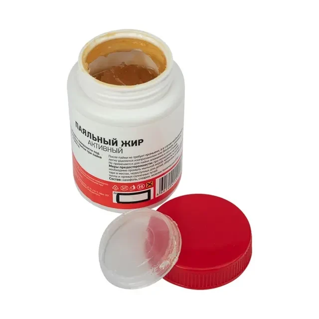 Активный паяльный жир предназначен для удаления оксидов с поверхности под пайку, улучшения растекания жидкого припоя при пайке сильно окисленных деталей, черных и цветных металлов, углеродистых сталей, меди и никеля. Используется для замены паяльной кислоты. Не применяется для пайки алюминия, его сплавов и электротехнической аппаратуры! Изготовлен в соответствии с ГОСТ 19250-73. Хорошо держится на металлических контактах, обеспечивая точное дозирование и высокую скорость нанесения. Ускоряет процесс лужения контактов, медленно испаряется на жале, не оставляя нагара. Остатки флюса удаляются спиртовыми растворами или смывочными жидкостями. Температура наибольшей активности: +150…+350°С. Состав: вазелин технический (ВТВ-1), парафин, хлорид цинка, хлорид аммония и вода деионизованная. Фасовка – банка 100 мл. Флюс с таким же составом выпускают известные фирмы: Stannol, Felder, CHEMET, ERSA, GOOT.