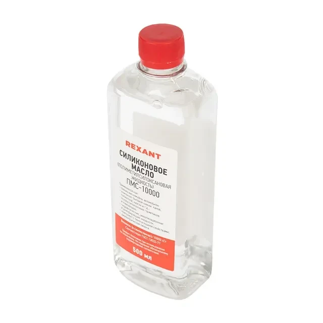 Полиметилсилоксановая жидкость ПМС-10000 (ГОСТ 13032-77) REXANT – бесцветная, прозрачная, химически инертная и коррозионностойкая силиконовая жидкость без запаха. В отличие от минеральных или синтетических масел, данная жидкость обладает превосходными электроизоляционными, антиадгезионными и пеногасящими свойствами. Область применения: Смазывание резиновых уплотнений и обработка высоковольтных проводов. Основа низкотемпературных и высокотемпературных: а) консистентных смазок, паст и вазелинов; б) моторных и трансмиссионных масел. В качестве разделительной (металл-пластик, пластик-резина и т. п.) и антиадгезионной смазки пресс-форм при формовании и экструдировании изделий из пластических материалов: а) при производстве резинотехнических и пластмассовых изделий; б) в шинной промышленности; в) для конвейерных лент; г) при производстве каучука; д) при производстве пластмассовых изделий. Жидкость для приборов и механизмов: а) охлаждающая; б) амортизационная; в) гидравлическая; г) демпфирующая; д) диэлектрическая; е) антиадгезионная; ж) разделительная. Как теплоноситель с диапазоном температур –100...+300 °C. Как добавка в политуры и различные средства бытовой химии в: а) полирующие составы и мастики; б) полирующие составы для мебели; в) полирующие составы для автомобилей; г) средства бытовой химии; д) косметические средства, основа кремов от загара, губной помады и прочее; е) составы по уходу за волосами; ж) составы по уходу за обувью, кожаных изделий; з) мастики для пола. Замасливатель для шерстяных полуфабрикатов в чесальном и ткацком производствах. Для силовых трансформаторов, выпрямителей, магнетронов и т. д., как охлаждающая и диэлектрическая жидкость (в т. ч. замена совтола-10). Как жидкость для повышения прочности и бездефектности при обработке стеклоизделий и стерилизации медицинских инструментов. Основа пеногасителей для: а) текстильной промышленности; б) буровых растворов нефтяной и газовой промышленности; в) для любых процессов и производств; г) пищевой промышленности (стабилизирующая, противопенная добавка Е900). В текстильной промышленности для смягчения тканей из хлопка и синтетики, придания техническим тканям свойств водоотталкивания и абразивной прочности. Для производства различных эмульсий и добавок при изготовлении красок, герметиков, защитных и полирующих покрытий, клеев и т. д. Таким образом, области применения силиконовых жидкостей постоянно расширяются благодаря улучшению технологии производства и уменьшении стоимости ее производства. Основные свойства: Жидкости ПМС стойки к высоким и низким температурам, не образуют остатков на обрабатываемых поверхностях, предотвращают прилипание термопластичных материалов друг к другу. Стабильность физических свойств жидкостей ПМС в широком диапазоне рабочих температур –40...+200 °С Отличные характеристики вязкости/температуры, высокая сжимаемость и сопротивление сдвигу. Жидкости ПМС придают отличные свойства скольжения и гидрофобности пластмассам и резинам, уменьшают трение поверхностей. Электрические характеристики жидкостей ПМС практически неизменны при высоких и низких температурах в широком диапазоне частот. Образуют гидрофобную защитную пленку. Стойкость к радиации. Низкое поверхностное натяжение, сильные гидрофобные свойства. Температура застывания ниже –60 