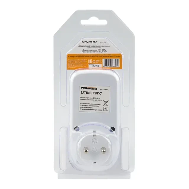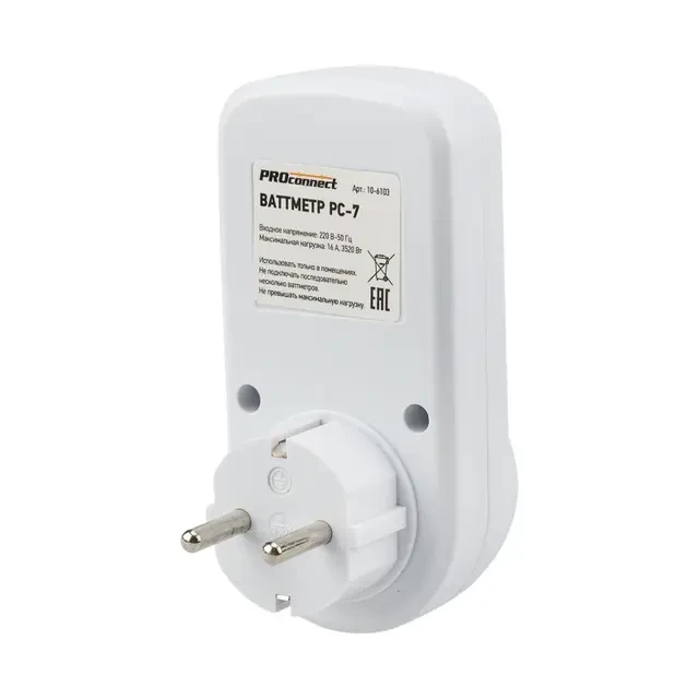 Бытовые ваттметры в розетку (счетчики потребляемой энергии) используются для замера потребляемой мощности различными электроприборами, такими как чайник, холодильник, телевизор, кондиционер, обогреватель, стиральная машина и т.д., суммарный ток которых не превышает 16А. Осуществляют контроль над потреблением энергии устройствами, подключенными к устройству через стационарный сетевой шнур. Благодаря функции смены отображаемого дисплея ваттметры дополнительно показывают несколько параметров: текущую мощность сети, суммарную потребленную прибором мощность в киловатт-часах и общую стоимость электроэнергии. Ваттметры оснащены возможностью установки цены киловатт-часа, что позволяет одновременно рассчитать суммарную стоимость потребленной электроэнергии. Модель используется для измерения энергопотребления при однотарифном учете. Ваттметр PC-7 оснащен ЖК дисплеем и тремя кнопками управления. Отображаемые параметры: Активная потребляемая мощность подключенной нагрузки Количество кВт/ч, потребленных подключенной нагрузкой Суммарная стоимость потребленной электроэнергии Цена одного кВт/ч Технические характеристики: Вход: 220 V~50 Гц Максимальная нагрузка: 16 A, 3680 Вт Минимальная отображаемая мощность: 0,1 Вт Точность измерения: +/- 1 % или +/- 0,1 Ватт (0-100 Ватт); +/- 1 % (100-3600 Ватт) Точность подсчета суммарного энергопотребления: +/- 1 % Минимальное отображаемое энергопотребление: 0,01 кВт/ч Диапазон суммарного энергопотребления: 0,00-9999,99 кВт/ч Диапазон цены одного кВт/ч: 0,00-9999 Энергопотребление в режиме ожидания: <0.5 W Рабочая температура: 5...+40 °C
