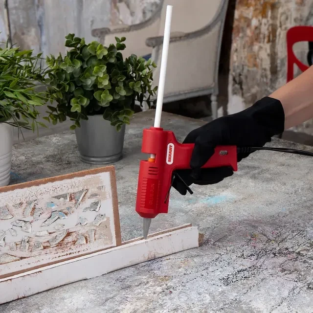 Клеевой пистолет предназначен склеивания поверхностей различных материалов, герметизации стыков и швов, фиксации проводов с помощью расплавленной клеевой массы. Используется в ремонте, декорировании, в изготовлении поделок и моделировании; будет полезен как на производстве, так и в быту. Корпус пистолета изготовлен из ударопрочной пластмассы, поэтому инструмент служит дольше, а металлическая скоба позволяет устанавливать пистолет в режиме ожидания. Сопло пистолета защищено клапаном от произвольного вытекания клея. Пистолет используется с клеевыми стрежнями диаметром 7 мм. Комплектация: клеевой пистолет (1 шт.), паспорт (1 шт.). ОСНОВНЫЕ ПРЕИМУЩЕСТВА 1. Быстрый нагрев. 2. Защита от произвольного вытекания клея из плавильной камеры. 3. Стабильная температура при постоянной работе. 4. Возможность управления одной рукой, легкий контроль плавления и подачи клея. 5. Индикация позволяет контролировать степень нагрева/готовности к эксплуатации, демонстрирует наличие питания (LED-лампочки красного и зеленого цветов на корпусе). 6. Удобен для работы с малогабаритными изделиями.