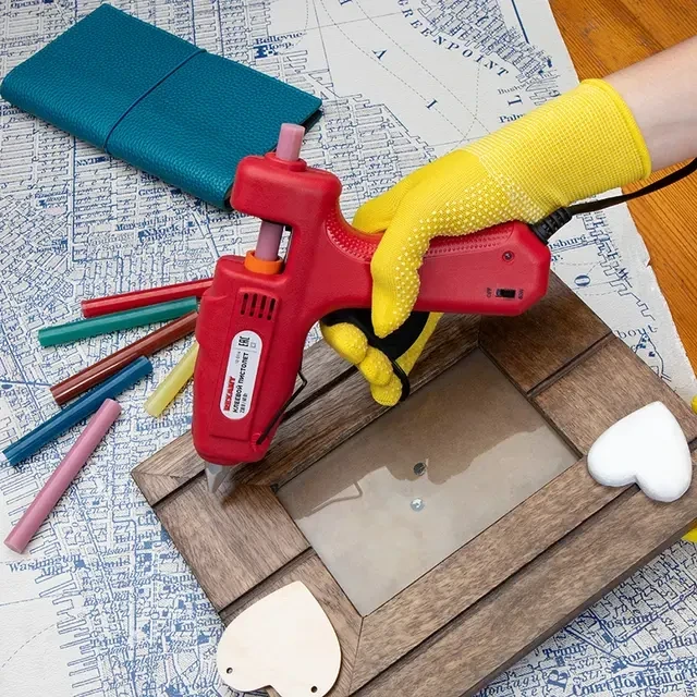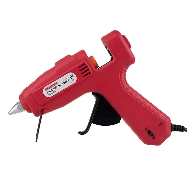 Клеевой пистолет предназначен склеивания поверхностей различных материалов, герметизации стыков и швов, фиксации проводов с помощью расплавленной клеевой массы. Используется в ремонте, декорировании, в изготовлении поделок и моделировании; будет полезен как на производстве, так и в быту. Корпус пистолета изготовлен из ударопрочной пластмассы, поэтому инструмент служит дольше, а металлическая скоба позволяет устанавливать пистолет в режиме ожидания. Сопло пистолета защищено клапаном от произвольного вытекания клея. На корпусе пистолета есть кнопка включения, благодаря которой пользователю удобнее контролировать использование пистолета. Также на корпусе есть индикатор, который показывает, что включен режим нагрева. Пистолет используется с клеевыми стрежнями диаметром 11 мм. Комплектация: клеевой пистолет (1 шт.), паспорт (1 шт.). ОСНОВНЫЕ ПРЕИМУЩЕСТВА 1. Быстрый нагрев. 2. Защита от произвольного вытекания клея из плавильной камеры. 3. Стабильная температура при постоянной работе. 4. Возможность управления одной рукой, легкий контроль плавления и подачи клея. 5. Индикация демонстрирует наличие питания (LED-лампочки красного цвета на корпусе).