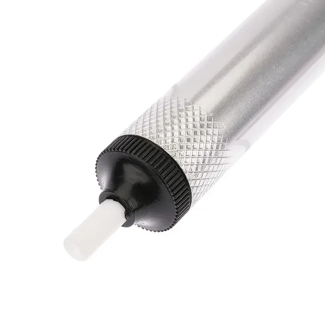 Оловоотсос для припоя, металл (экстрактор припоя) REXANT служит для удаления излишков или остатков металлического припоя и флюса, которые образуются в процессе монтажа или демонтажа радиоэлементов. Представляет собой цилиндрическую трубку, с вмонтированным внутри нее поршнем, который имеет фиксатор, и при создании разряжения работает как обычный шприц. Он рассчитан на работу одной рукой. Корпус изготавливается из металла (алюминий) и легко разбирается для обслуживания (смазка и очистка). Забор припоя производится посредством антистатического наконечника (диаметр 3.2 мм), который выполнен из высокотемпературного тефлона. Особенность данного оловоотсоса - специальный чистящий стержень, который удаляет остатки припоя после каждого использования, не допуская таким образом засорения канала.