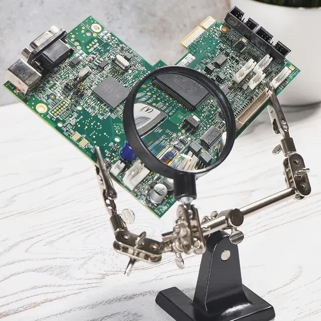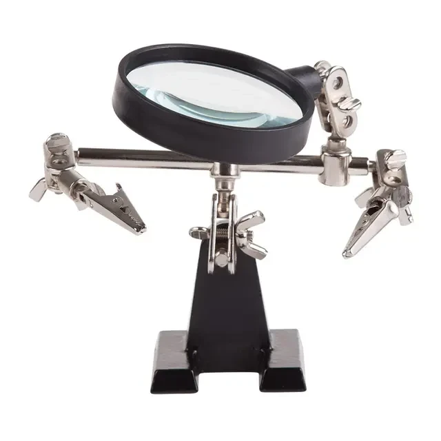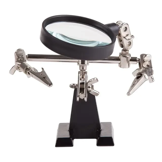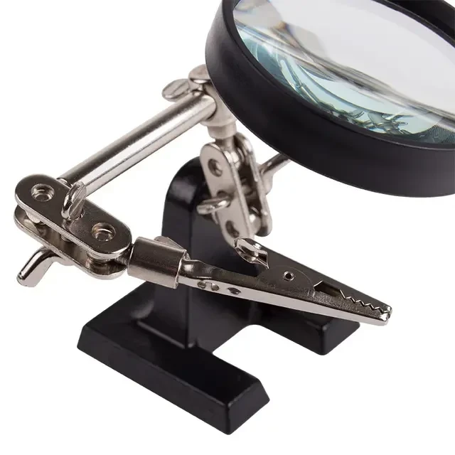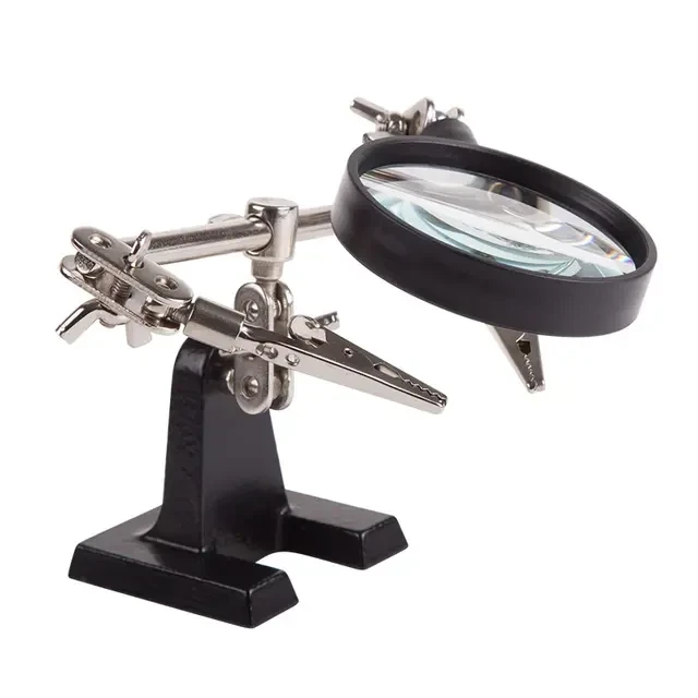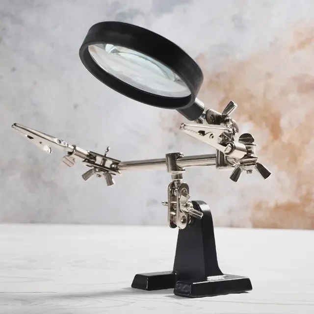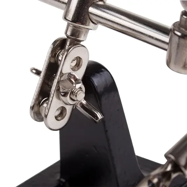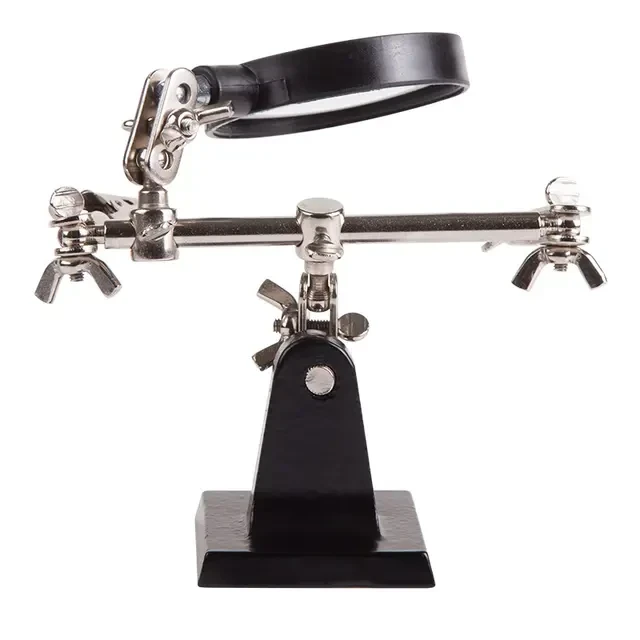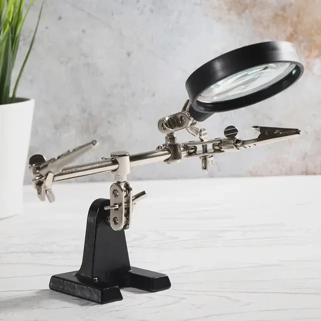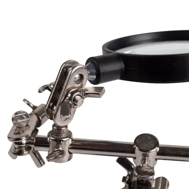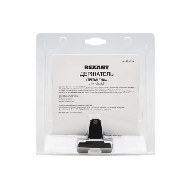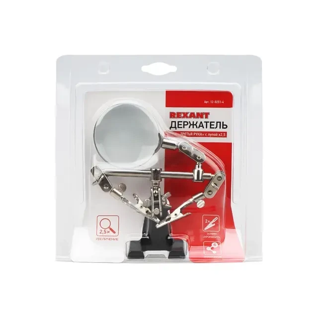 Держатель «третья рука» с лупой х2.5 REXANT служит, главным образом, при проведении паяльно-сборочных работ в электронике, ювелирном деле, сборке и ремонте для зажима мелких деталей в любом нужном положении, когда не хватает двух рук. Инструмент состоит из чугунного основания (тяжелая подставка), шарнирного соединения с зажимами типа «крокодил» (подвижных во всех плоскостях) с никелевым покрытием и лупы с 2.5 кратным увеличением (возможность регулировки положения, диаметр линзы 60 мм). С помощью лупы можно будет рассмотреть даже самые мелкие детали.
