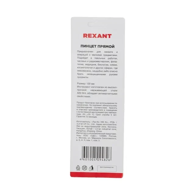 Стальной пинцет REXANT используется для проведения манипуляций с различными небольшими предметами и деталями, такими как крепеж, шестеренки, марки, драгоценные камни и пр. Широко применяется в паяльных и ручных работах, сборочном производстве, филателии, ювелирном деле, робототехнике, промывке золота и т. д. Изготовлен из долговечной нержавеющей стали AISI 304, устойчивой к поражению коррозией. Заостренные концы позволяют производить работы в труднодоступных местах. Оптимальная длина и небольшой вес пинцета делают работу наиболее комфортной. Для удобства хранения и транспортировки предусмотрен пластиковый колпачок, который защищает концы пинцета.