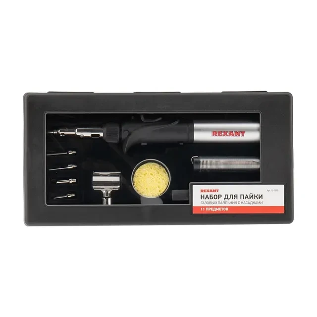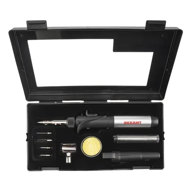 Паяльник газовый с резервуаром 17мл REXANT предназначен для экстренного ремонта электроники, плавки и сварки пластиковых частей, нагрева малых металлических элементов, плавки металла с низкой температурой плавления, ремонта ювелирных изделий, сгибания тонких стеклянных трубок, прогрева механизмов в холодное время года и т.д. Устройство состоит из резервуара с газом и горелки, на которую может устанавливаться паяльное жало и другие насадки. Газовая пайка может осуществляться как посредством нагретого воздуха, когда используется только горелка, так и при использовании разных насадок. Данный прибор оснащен функцией регулировки пламени, защитой от несанкционированного включения, а также фиксацией включенного положения. Разогрев паяльника осуществляется менее чем за 30 секунд. Прибор имеет компактные размеры и является полностью автономным. В набор входит: горелка с пьезоподжигом, 5 насадок для пайки, насадка для термоусадки, губка для очистки жала в круглой нише, защитный колпачок для жала, колба с припоем (60% олово, 40% свинец), переходник для сменных жал.