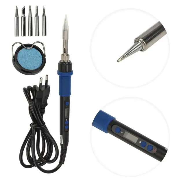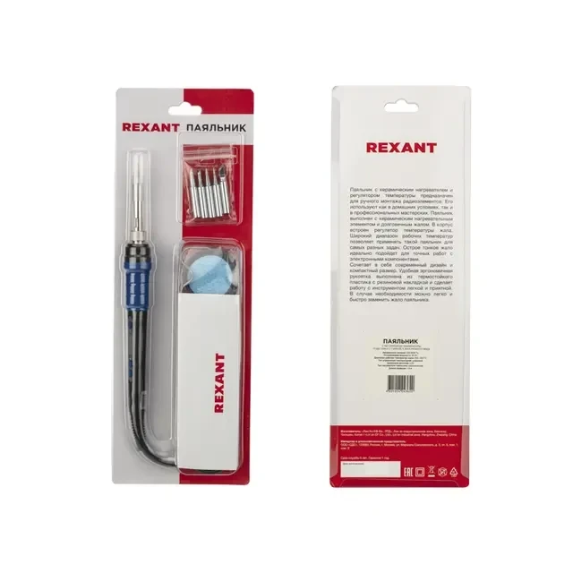 Паяльник с керамическим нагревателем и цифровым регулятором температуры REXANT предназначен для ручного монтажа радиоэлементов. Его используют как в домашних условиях, так и в профессиональных мастерских. Паяльник выполнен с керамическим нагревательным элементом, долговечным жалом и цифровой регулятором температуры. В корпус встроен цифровой регулятор температуры в диапазоне 200...500 °C. Широкий диапазон рабочих температур позволяет применять такой паяльник для самых разных задач. Острое тонкое жало идеально подойдет для точных работ с электронными компонентами. Сочетает в себе современный дизайн и компактный размер. Удобная эргономичная рукоятка выполнена из термостойкого пластика с резиновой накладкой, она сделает работу с инструментом легкой и приятной. В случае необходимости можно легко и быстро заменить жало паяльника. Комплектация: паяльник, подставка, 5 жал разных типов. ТЕХНИЧЕСКИЕ ХАРАКТЕРИСТИКИ Напряжение питания: 220-230 В 50 Гц Потребляемая мощность: 65 Вт Диапазон рабочих температур жала: 200...500 °C Тип управления температурой: цифровой Цифровой дисплей: есть Тип нагревателя паяльника: керамический Габаритные размеры: 20.4х2.5х2.5 см Длина провода: 1.3 м
