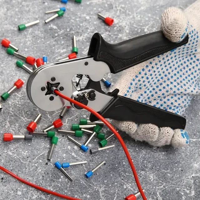 Кримпер HT-864 предназначен для опрессовки штыревых наконечников сечением 0,25–6 мм². Корпус кримпера изготовлен из высокопрочной закаленной инструментальной стали с хромированием, что обеспечивает длительный срок службы и устойчивость к механическим нагрузкам. Четырехсегментная саморегулирующаяся матрица с системой поворотных кулачков диафрагменного типа выполняет квадратный профиль обжима с рифлением, обеспечивая равномерное распределение силы обжима. Регулятор давления позволяет настроить оптимальное усилие обжима для разных типов клемм. Возвратный механизм автоматически возвращает ручки в исходное положение после каждого цикла обжима. Храповой механизм обеспечивает качественную опрессовку без преждевременного разжатия ручек. Нескользящие рукоятки выполнены из плотного синтетического материала, что делает работу комфортной и безопасной даже при длительном использовании.