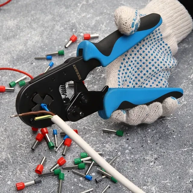 Кримпер HT-8164 предназначен для опрессовки штыревых наконечников сечением 6–16 мм². Корпус инструмента изготовлен из высокопрочной хром-ванадиевой стали с воронением, что обеспечивает длительный срок службы и устойчивость к механическим нагрузкам. Четырехсегментная саморегулирующаяся матрица с системой поворотных кулачков диафрагменного типа выполняет квадратный профиль обжима, обеспечивая равномерное распределение силы. Регулятор давления позволяет настроить оптимальное усилие обжима для разных типов клемм. Возвратный механизм автоматически возвращает ручки в исходное положение после каждого цикла обжима. Храповой механизм обеспечивает качественную опрессовку без преждевременного разжатия ручек. Двухкомпонентные нескользящие рукоятки выполнены из плотного синтетического материала, что делает работу комфортной и безопасной даже при длительном использовании.