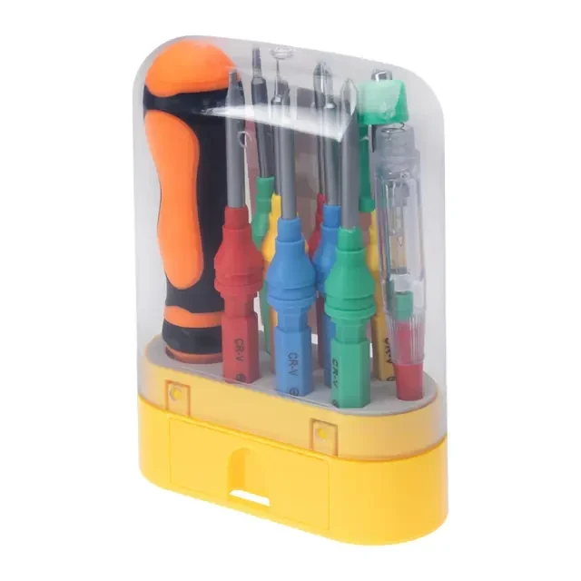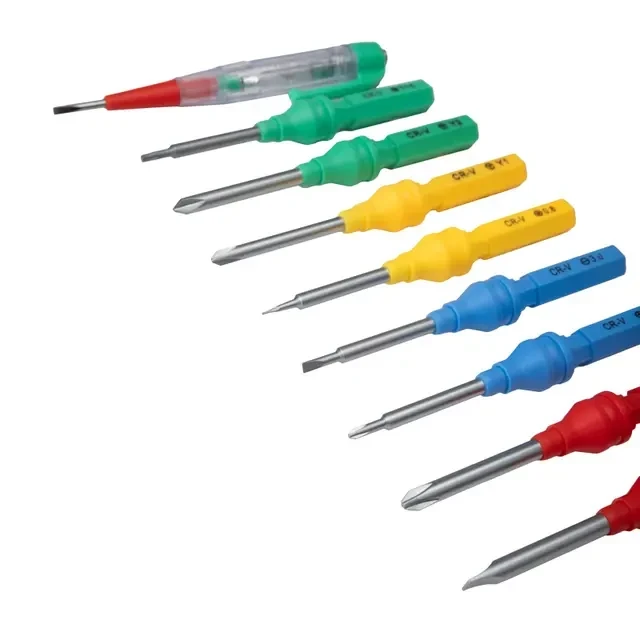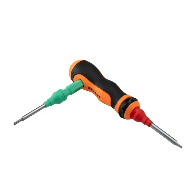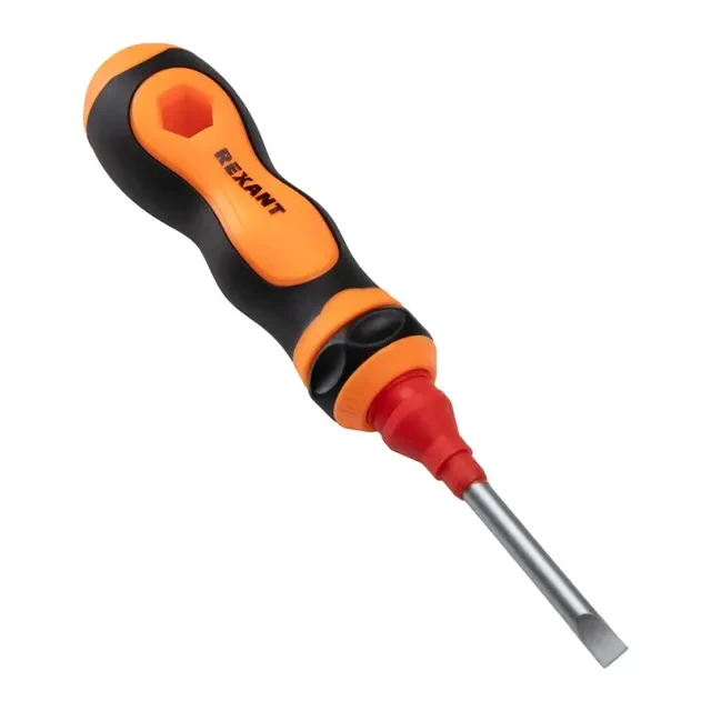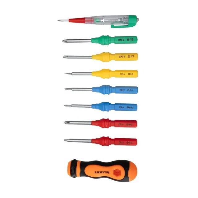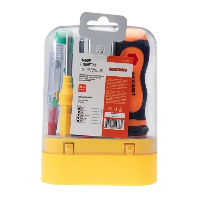 Набор отверток REXANT 10 в 1 предназначен для выполнения монтажных и демонтажных работ с резьбовыми соединениями: шурупами, саморезами и т. д. Инструменты выполнены из качественной хромованадиевой стали. Двухкомпонентная рукоятка оснащена магнитным держателем, что обеспечивает быструю замену и надежную фиксацию бит. В основании инструмента предусмотрено шестигранное отверстие: если установить в него одну из насадок, то можно получить дополнительный рычаг усилия при работе. Набор укомплектован тестером-пробником: предназначен для быстрой и эффективной диагностики электрооборудования (домашних приборов, ламп накаливания, предохранителей). Для удобства хранения и транспортировки все инструменты поставляются в пластиковом футляре. В наборе поставляются биты: SL3.0, SL6.0, PH0, PH 2, Y1, T10, ★0.8, Y2.