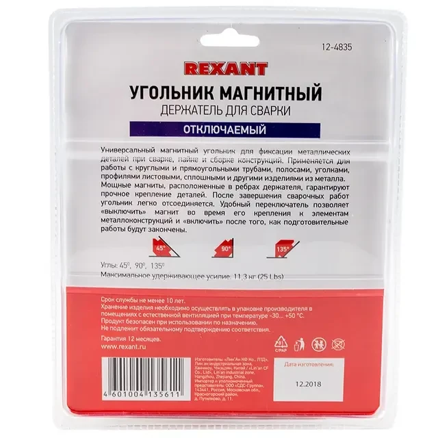 Магнитный угольник-держатель для сварки, отключаемый на 3 угла, усилие 11,3 кг REXANT, предназначен для фиксации металлических деталей при сварке, пайке и сборке конструкций. Применяется для работы с круглыми и прямоугольными трубами, полосами, уголками, профилями, листовым, сплошным и другими видами металла. Угольник быстро и надежно соединяет детали, сокращает время работы, облегчает монтаж и заменяет громоздкие зажимы и неудобные струбцины. Удобный переключатель позволяет «выключить» магнит во время его крепления к элементам металлоконструкций и «включить» после того, как подготовительные работы будут закончены. Углы: 45°, 90°, 135° Максимальное усилие: 11,3 кг (25 Lbs)