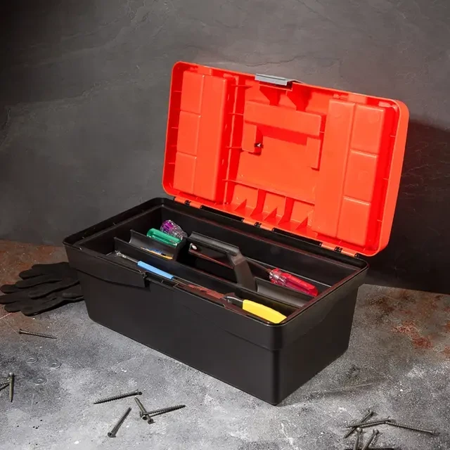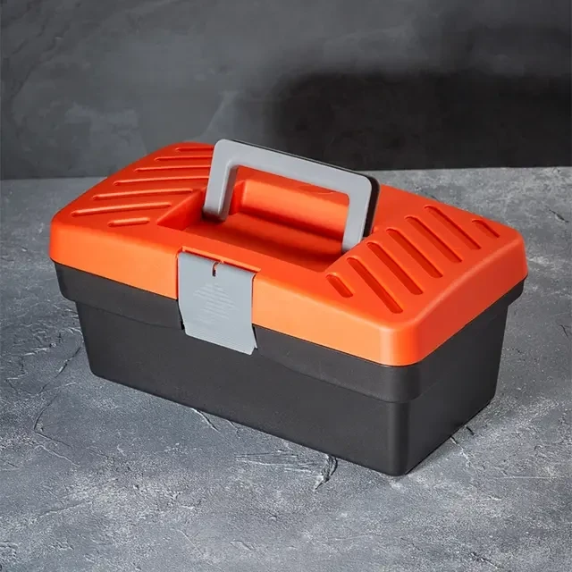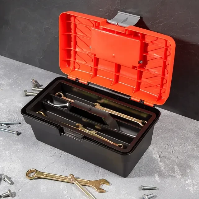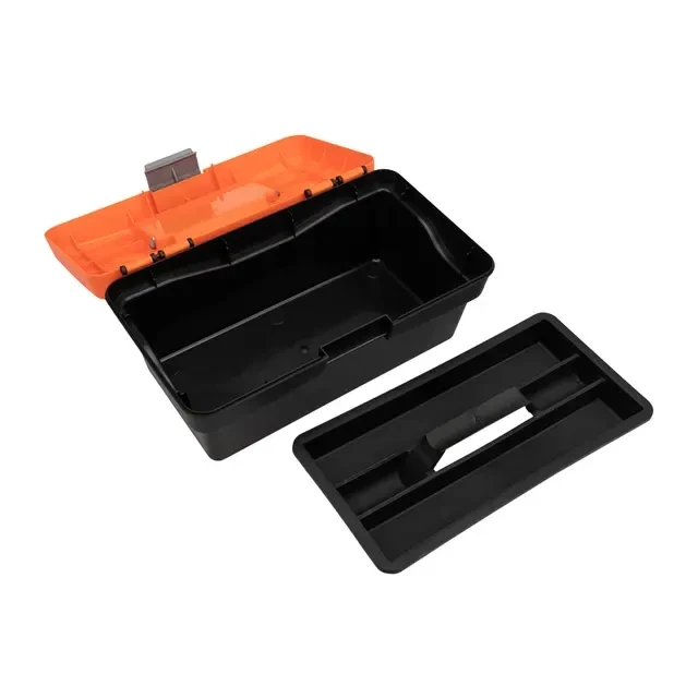 Ящик для инструментов PROconnect выполнен из прочного пластика. Обладает съемным 3-секционным лотком с удобной ручкой. Ящик предназначен для хранения и транспортировки инструментов, крепежных изделий, расходных материалов, в том числе различных предметов, схожих по габаритам. На крышке есть складная ручка. Удобный замок можно открыть одной рукой. Характеристики: Размеры: 285х155х125 мм Материал: полипропилен Цвет: черный, оранжевый Преимущества: Удобная ручка Подходит для бытового и профессионального использования Выполнен из прочных долговечных материалов