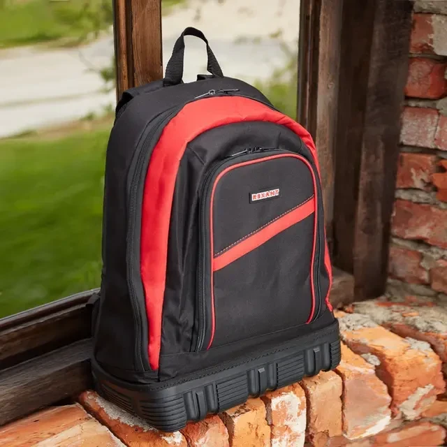Рюкзак монтажника с резиновым дном REXANT RE-12 оснащен 12 карманами и предназначен для комфортной транспортировки инструментов. Выполнен из водонепроницаемого комбинированного материала, пропитанного полиуретановым составом и поливинилхлоридом, который используют в изготовлении тентов для шатров, торговых палаток и различного снаряжения для туристических поездок. Характеристики: Габариты: 32.5х17.5х42.5 см Материал: ткань «Оксфорд» 600D PVC PU Максимальный выдерживаемый вес: до 10 кг Вес рюкзака: 1.65 кг Цвет: черный, красный Преимущества: Переднее и заднее внутреннее отделения оснащены отдельными молниями Широкие мягкие регулирующиеся лямки и поясной ремень Надежная ручка для переноски Мягкие анатомические вставки на спинке рюкзака Водозащитное резиновое дно с высокими бортиками Прочные усиленные молнии с крупными звеньями