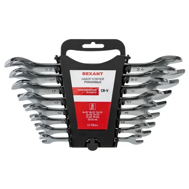 Набор рожковых гаечных ключей REXANT предназначен для монтажа и демонтажа резьбовых соединений: болтов, гаек, муфт и т. д. Хромованадиевый сплав, из которого изготовлены ключи, обладает такими свойствами, как прочность, жесткость, устойчивость к износу. Инструменты обладают высокой устойчивостью к коррозии благодаря хромовому покрытию. Просты в обращении и обеспечивают доступ к любому крепежу. Размеры: 8х10, 10х12, 12х13, 14х15, 13х17, 17х19, 19х22, 22х24 мм. Ключи поставляются в пластиковом футляре для удобного хранения и транспортировки.