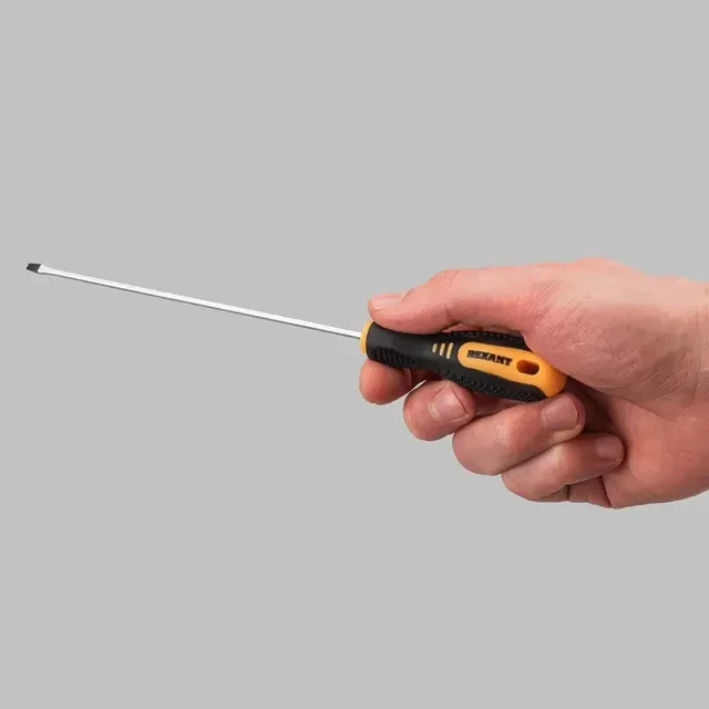 Отвертка шлицевая REXANT используется для монтажа и демонтажа резьбовых соединений (шурупов, саморезов), имеющих на головке прямой паз. Оснащена эргономичной двухкомпонентной рукояткой, которая предотвращает скольжение в ладони и обеспечивает более комфортную работу. Инструмент обладает стержнем, который изготовлен из высококачественной хромованадиевой стали, характеризующейся высокой стойкостью к коррозии. Благодаря оксидированному намагниченному наконечнику крепежная деталь не упадет при извлечении или установке. В основании инструмента предусмотрено отверстие для его подвеса.