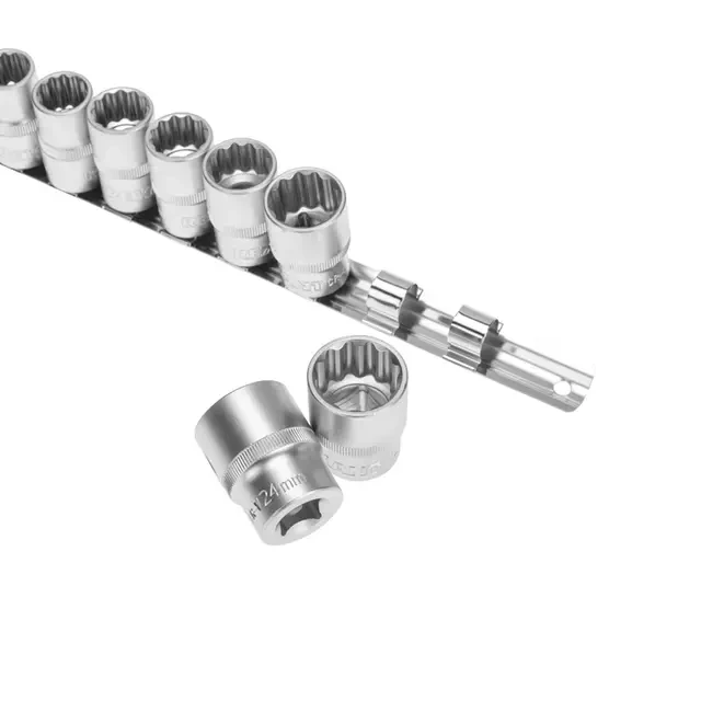Набор головок REXANT используется для монтажа и демонтажа резьбовых соединений. Широко применяется при ремонте автомобилей и различного оборудования. Инструменты изготовлены из хромованадиевой износостойкой и долговечной стали с хромоникелевым покрытием. В наборе 10 съемных торцевых головок: 10, 12, 13, 14, 15, 16, 17, 19, 22 и 24 мм, которые имеют 12-гранный зев. Это позволяет осуществлять вращение крепежа с меньшим углом поворота (30 градусов) по сравнению с 6-гранным зевом. Ярко-красная полоска, нанесенная на головки, предназначена для удобного поиска. Изделия поставляются на металлической планке и упакованы в блистер.