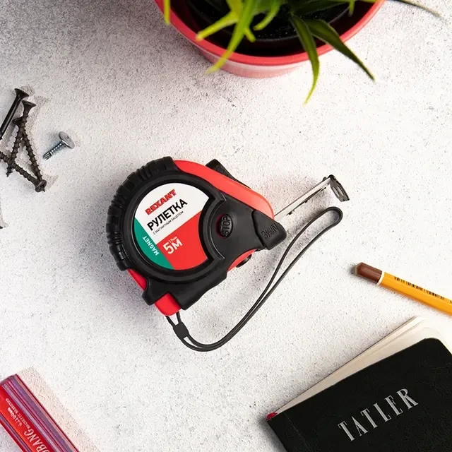 Измерительная рулетка REXANT Профи необходима при проведении измерительных работ в строительстве, хозяйстве, ландшафтных и геодезических исследованиях. Двухкомпонентный прорезиненный корпус, выполненный из ударопрочного пластика, не скользит в руках. Прочное полотно без изломов имеет глянцевое покрытие и обладает удобным зацепом с магнитами. Для удобства использования предусмотрены кнопки стопора и фиксации тормоза. На корпусе расположена клипса-зажим для фиксации рулетки на ремне, кармане или поясной сумке. Ремешок позволяет надевать инструмент на запястье, чтобы освободить руки для работы.