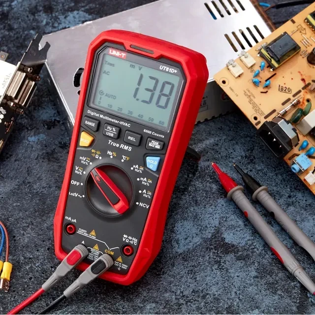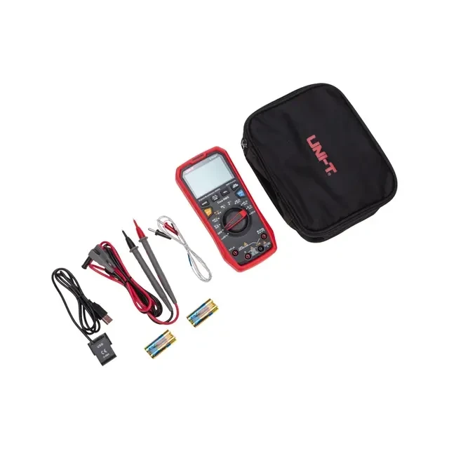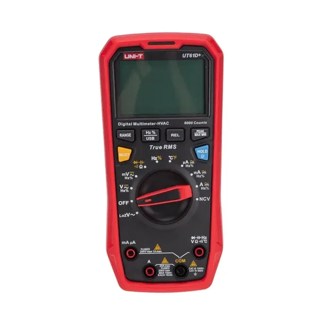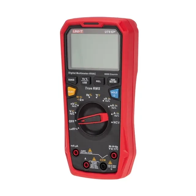Профессиональный TRUE RMS мультиметр последнего поколения UNI-T UT61D+ с ударопрочным корпусом применяется с целью измерения постоянного/переменного напряжения, силы тока, сопротивления, емкости и частоты с большим разрешением и точностью. Призван заменить сразу снятые с производства модели 61C и 61D. Присутствует LoZ (вход с низким импедансом), аналоговая шкала. Дисплей на 6 000 разрядов с подсветкой облегчает считывание результатов при слабом внешнем освещении. Функция удержания данных обеспечивает удобство при работе в местах с ограниченным доступом. Выбор диапазона измерения производится автоматически или вручную. В устройстве предусмотрена прозвонка межсоединений со звуковым сигналом, диодный тест и защитный холстер. Во всех приборах серии имеется USB интерфейс и кабель для работы с ПК. Прибор имеет режимы относительных, максимальных/минимальных измерений. Оснащен функцией сохранения показаний DATA HOLD, индикацией режима измерений и разряда батареи. Технические характеристики UNI-T UT61D+: Постоянное напряжение: 1000 В ± (0.05%+3) Переменное напряжение: 1000 В ± (1%+3) Постоянный ток: 220 мА/20 А ± (1%+2) Переменный ток: 220 мА/20 А ± (1.2%+5) Сопротивление: 60МОм ± (1%+2) Емкость: 1 пФ-60 000 мкФ ± (3%+5) Частота: 0,001 Гц-10 МГц ± (0.1%+4) Температура: -40℃~1000℃ ± (1%+3), -40℉~1832℉ ± (1%+6) Коэффициент заполнения (скважность): 0.1~99.9 % ± (2%+5) Диод-тест: да Питание: 4х1.5В AAA Размеры: 190х90х50мм Вес: 0.350 кг Комплектация: мультиметр, позолоченные щупы, термопара, кабель USB с переходником к мультиметру, батарея, инструкция по эксплуатации, программное обеспечение и инструкция по его установке.