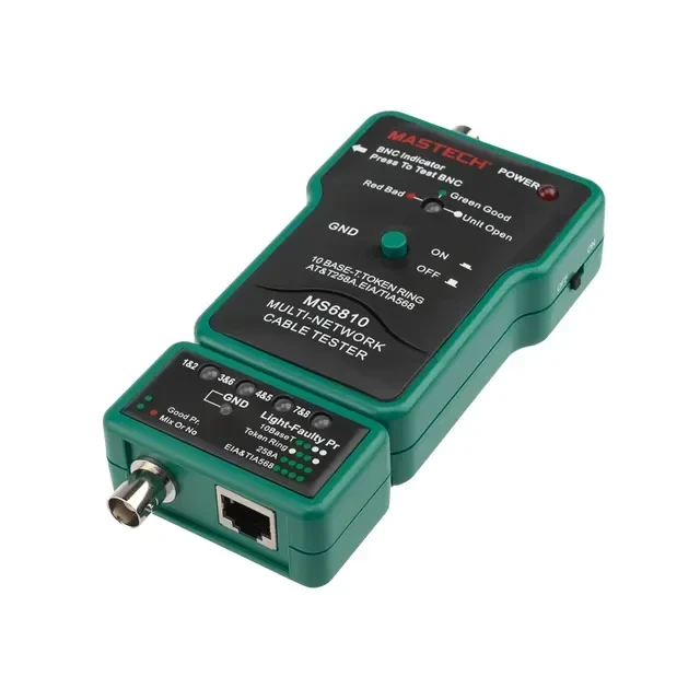 MASTECH MS6810 — многофункциональный сетевой тестер кабеля может использоваться для проверки коаксиальных кабелей (BNC), неэкранированных кабелей типа «витая пара» (UTP), экранированных кабелей типа «витая пара» (STP). Автоматически проверяет наличие обрывов, коротких замыканий, перестановки и реверса пар. Характеристики: Максимальная длина тестируемого кабеля "витая пара": 200м Проверка коаксиальных кабелей (BNC) Проверка экранированного и неэкранированного кабеля на основе скрученных пар («витая пара» RJ45) на соответствие стандартам T568A, T568B, 10Base-T и Token Ring Высокоскоростная проверка Удобная диагностика ошибок на дисплее Спящий режим Режим автоматического отключения питания Светодиодный индикатор уровня низкой зарядки батареи Размер тестера: 110х70х25 мм, съемного терминала: 60х35х25 мм Прибор состоит из основного и съемного блоков. В нерабочем состоянии съемный блок хранится пристегнутым к основному блоку. Комплектация: нейлоновый чехол, инструкция