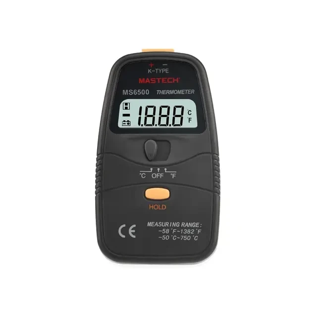 Цифровой термометр MS6500 позволяет измерить температуру окружающей среды или какого-либо предмета. В приборе применяется термопара типа «К», например 13-2036, которая подключается через разъем в верхней части корпуса. С помощью переключателя можно изменять полученные данные и измерять температуру по шкале Цельсия и по шкале Фаренгейта. Полученные данные можно сохранить с помощью функции DATA HOLD. Характеристики: Диапазон измерения: –50...+750 °С Дисплей 31/2 разряда (max. 1999) Измерения посредством термопары К-типа Режим удерживания данных на дисплее DATA HOLD Показания в °С/°F Разрешающая способность 1 °С/1 °F Размеры: 125.5х72х27 мм Вес: 145 г