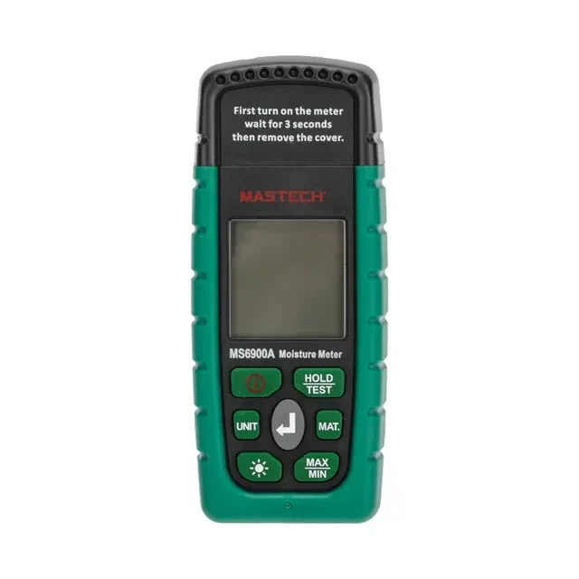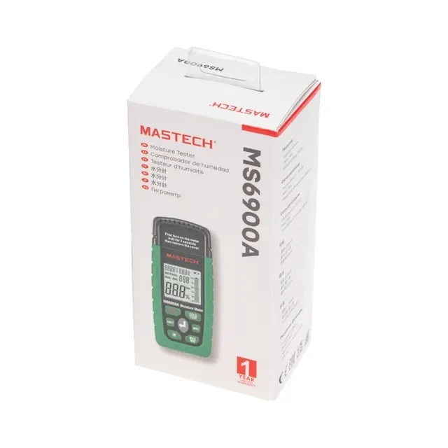 Профессиональный цифровой влагомер MASTECH MS6900 позволяет измерять содержание влаги в древесине, стройматериалах, хлопке, бумаге, табаке и т. д. С помощью него можно определять температуру и влажность воздуха, отслеживать максимальные и минимальные показания влаги. Малые вес и габариты прибора способствуют комфортной работе пользователя. Он работает от 2 батареек 1,5 В ААА. Модель поставляется в сумке, в которой ее удобно хранить и транспортировать. Влагомер позволяет: Измерить температуру и влажность воздуха Измерить влажность материала (7 видов) Отслеживать максимальные и минимальные показания; Использовать память Параметры измерений: Влажности: 0-60% Температуры: -10…-50 °C Электропроводности: 0-99% Шаг/точность измерений: Влажность материала: 0,1%/± 2% Температура: 0.1 °C/± 2 °C Влажность: 0.1%/±5% Глубина измерений: 0-50 мм Рабочая температура: -10…-50 °C В комплекте: сумка, батарея Диапазон влажности материалов: 1: (8,5~60%) бук, ель, лиственница, береза, вишня, орех 2: (6,8~53,4%) дуб, кедр, клен, ясень 3: (0,9~24,5%) сглаживающий цемент, бетон 4: (0,0~12,2%) ангидритовая стяжка 5: (0,7~9,2%) цементный раствор 6: (0,5~11,1%) известковый раствор, гипс 7: (0,0~17,8%) кирпич Глубина измерений: 0-50 мм Рабочая температура: -10…-50 °C Комплект поставки: прибор, инструкция, чехол, батарея Батарея: 1.5 B AAA, 2 шт. Вес с батареей: 120 г Габариты: 130х56х29 мм