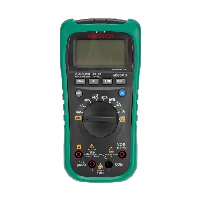 Профессиональный мультиметр MS8361D MASTECH T-RMS с возможностью беспроводного подключения к мобильным устройствам – это идеальное решение для профессиональных техников и инженеров. Пользователь получает возможность находиться на дистанции от измеряемого контура для снижения опасности во время осмотра или измерения. Приложение MASTECH позволяет просматривать запись и чтение данных на мобильном телефоне. Мультиметр великолепно оснащен, кроме измерений напряжений до 600 В и токов до 10 А, он также измеряет емкость, частоту и скважность и многое другое, имеет бесконтактный детектор напряжения NCВ, ручной и автоматический выбор диапазонов измерений. Технические характеристики: Дисплей 4000 отсчетов Авто и ручной выбор диапазона измерений Автоматическое отключение TRUE RMS Истинное среднеквадратичное значение переменного напряжения и переменного тока Прозвонка <50 Ω Тест диодов 3,2 В hFE 0 ~ 1000 Удержание данных Подсветка дисплея Режим относительных измерений Низкий уровень заряда батареи Бесконтактный детектор напряжения NCВ Беспроводное соединение с Android/IOS и работа через приложение Источник питания: 1x9 В, батарея 6F22 Размер: 188x92x50 мм Вес: 380 г Постоянное напряжение: 400 мВ/4 В/40 В/400 В 0,1 мВ/0,001 В/0,01 В/0,1 В ± (0,8% +3) 600 В 1 В ±(1,0% +5) Переменное напряжение: 400 мВ/4 В/40 В/400 В 0,1 мВ/0,001 В/0,01 В/0,1 В ±(1,0% +8) 600 В 1 В ±(1,2% +8) Постоянный ток: 400 мкА/4000 мкА/40 мА/400 мА 0,1 мкА/1 мкА/0,01 мА/0,1 мА ± (1,0% +10) 10 А 0,01 А ±(2,0% +5) Переменный ток: 400 мкА/4000 мкА/40 мА/400 мА 0,1 мкА/1 мкА/0,01 мА/0,1 мА ±(1,5% +5) 10 А 0,01 А ±(3,0% +5) Сопротивление: 400 Ом/4 кОм/40 кОм/400 кОм/4 МОм 0,1 Ом/0,001 кОм/0,01 кОм/0,1 кОм ±(0,8% +3) 40 МОм 0,001 МОм/0,01 МОм ±(1,5% +5) Емкость: 9,999 нФ 0,001 нФ ±(5,0% +5) 99.99 мФ/999.9 мФ/9.999 мФ/99.99 мФ/999.9 мФ/9.999 мФ/99.99 мФ/0.01 мФ/0.1 мФ/0.001 мФ/0.01 мФ/0.1 мкФ/0.001 мФ/0.01 мФ ±(4,0% +5) Частота (В): 99,99 Гц/999,9 Гц/9,999 кГц 0,01 Гц/0,1 Гц/0,001 кГц ±(1,5% +5) >10 кГц 0,01 кГц ±(1,5% +5) Частота (A): 99,99 Гц/999,9 Гц 0,01 Гц/0,1 Гц ±(1,5% +5) >1 кГц 0,001 кГц ±(1,5% +5) Частота (Гц): 9.999 Hz/99.99 Hz/999.9 Hz/9.999 kHz/99.99 kHz/999.9 kHz/9.999 MHz/0,001 Гц/0,01 Гц/0.1 Гц/0.001 kHz/0.01 kHz/0.1 kHz/0.001 MHz ±(0,3% +5) Рабочий цикл: 0,1% -99,9% 0,1% ±3,0%