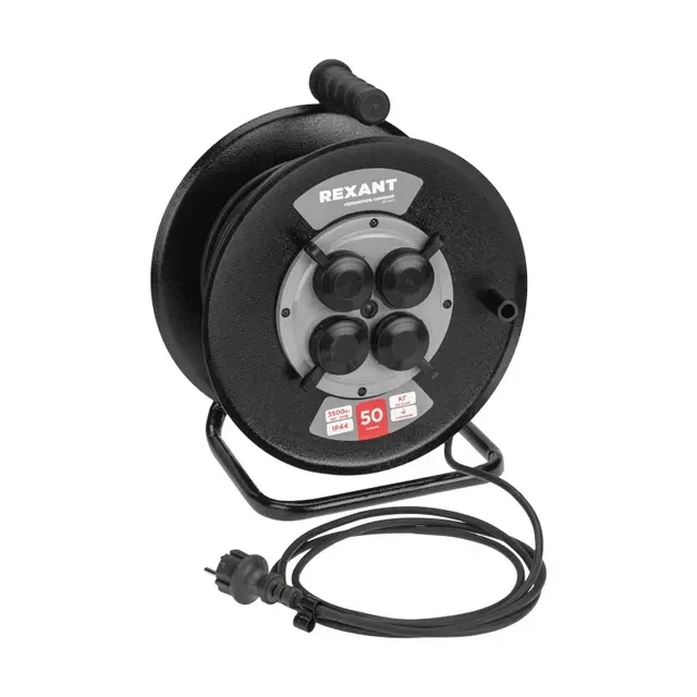 Удлинитель силовой КГ на катушке 4 гнезда, с/з, 50м, 3х1,5мм?, IP44 c защитными крышками, металлическая катушка REXANT
