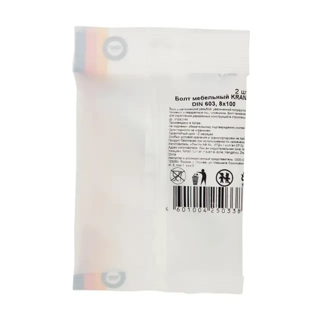 Мебельный болт DIN 603 8х100 мм предназначен для соединения деревянных и металлических конструкций при производстве мебели и в строительстве, для монтажа дорожных ограждений, для крепления узлов и деталей в машиностроении. Широко распространен в электротехнике при сборке щитков и конструкций кабеленесущих систем. Используется совместно с гайками и шайбами. Болты изготовлены из стали с гальваническим цинковым покрытием, которое защищает изделия от коррозии и механических повреждений. Квадратный подголовник предотвращает проворачивание болта в отверстии, а сферическая головка увеличенного диаметра не повреждает поверхность основания и придает аккуратный и эстетичный вид изделию. Поставляются в упаковке в количестве 2 штук.