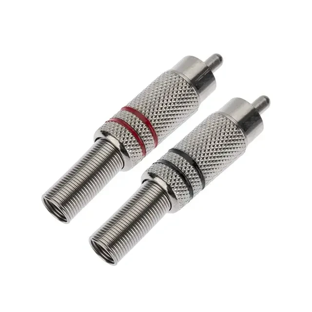 Разъем штекер RCA предназначен для соединения кабелей с видео- и аудиоаппаратурой. Применяется для передачи монофонического аудиосигнала или видеосигнала через кабель на профессиональные звуковые карты (для линейных входов и выходов), DVD-плееры, видеомагнитофоны, VHS-видеокамеры и т.д. Установка провода в разъеме производится с помощью пайки (центральная жила – пайка, оплетка – обжим). Соединение такого типа позволяет передавать сигнал с минимальным уровнем потерь, создавая качественный контакт. Корпус разъема и контакты изготовлены из металла, что обеспечивает высокую пропускную способность сигнала. Разъем оснащен металлическим пружинным амортизатором, позволяющим кабелю гнуться с безопасным радиусом изгиба. Для передачи стереозвука используются два тюльпана с черной и красной цветовой меткой, что позволяет идентифицировать левый или правый канал.