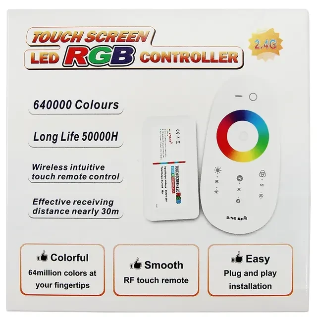 Беспроводной RGB контроллер с сенсорным управлением 2.4G для RGB светодиодных лент: • Изменение цвета свечения (16 млн цветов (оттенков)) • Регулирование яркости от 1 до 100 % • 20 режимов динамики • Действие пульта ДУ до 30 м • Возможность управления с iOS (опционально) • DC 12-24 V, 18 A 12 V <216 W (15 м* RGB ленты 12 V 60 LED/m) 24 V <432 W * - для подключения большей длины ленты используйте LED усилитель, либо можно использовать несколько контроллеров одновременно. Пульт имеет возможность привязки к нескольким блокам диммера, чтобы синхронно управлять ими.