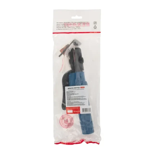 Держатель электрода REXANT 300А E-type предназначен для фиксации электрода при проведении ручной сварки. Прочный и универсальный в применении инструмент гарантирует жесткую фиксацию широкого диапазона используемых габаритов электродов и сварочного кабеля. Производителем предусмотрена надежная фиксация электрода в четырех положениях благодаря рельефу зажимной пластины. Удобная ручка надежно изолирована пластиковым материалом, который выдерживает высокие механические и технические нагрузки. Габаритные размеры: 230x35x35 мм Диаметр применяемых электродов: 2,0-5,0 мм Масса: 0.26 кг Наибольший сварочный ток при ПВ=35%: 300 А Номинальный сварочный ток: 300 А Продолжительность цикла сварки: 5 мин Сечение жилы подсоединяемого сварочного кабеля: до 50,0 мм² Угол закрепления электрода без подгиба, с подгибом: 0…270° Усилие прижатия электрода: 12.5-25 кгс Напряжение: до 50 В