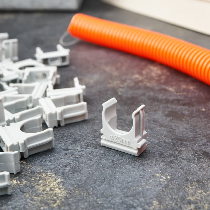 Крепеж для гофры, гофротрубы (клипса для гофротрубы), труб ПВХ и кабеля изготовлен из качественных материалов по передовым технологиям пластикового литья. Оптимальная форма с грамотно расположенными ребрами жесткости обеспечивают надежный захват трубы и достаточную жесткость удержания в течении длительного времени. Качественный пластик и прочностные ребра жесткости не дают ломаться зажиму на холоде и слабнуть на жаре. Зажимы противостоят ультрафиолетовым излучениям, солям, кислой среде и алкалинам.