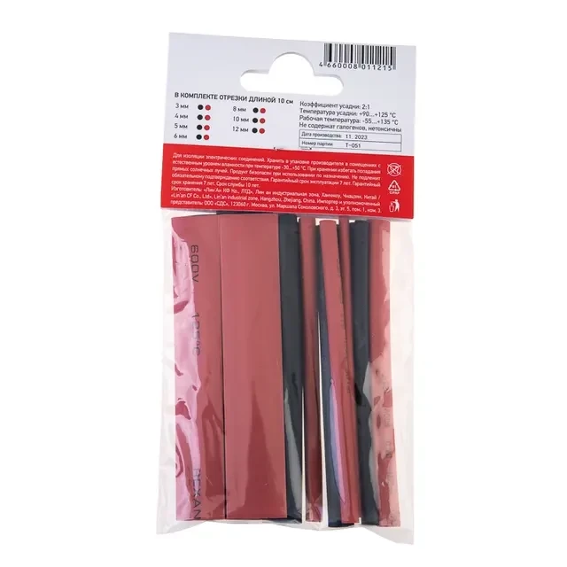Набор №6 MAXIMUM оптимально подобран для использования в любых ситуациях. Состоит из термоусаживаемых трубок, предназначенных для восстановления и создания изоляции, герметизации электрических соединений проводов, маркировки, а также для защиты от коррозии, истирания, пыли, химикатов и механических повреждений. В результате нагрева трубки меняют свой диаметр, сжимаются и принимают форму предмета или материала. Изделия, входящие в состав набора, выполнены из экологически безопасных материалов, не содержащих галогенов. Трубки не поддерживают горение: в отсутствие открытого огня затухают и не воспламеняются. Это обеспечивает дополнительную безопасность в случае возникновения пожара. Состав набора: 3 мм – 2 шт. (красный, черный); 4 мм – 2 шт. (красный, черный); 5 мм – 2 шт. (красный, черный); 6 мм – 2 шт. (красный, черный); 8 мм – 2 шт. (красный, черный); 10 мм – 2 шт. (красный, черный); 12 мм – 2 шт. (красный, черный). Гарантийный срок эксплуатации – 7 лет. Гарантийный срок хранения – 7 лет. Рекомендуем проводить работы по усадке трубок с помощью специальных электромонтажных фенов и газовых горелок REXANT