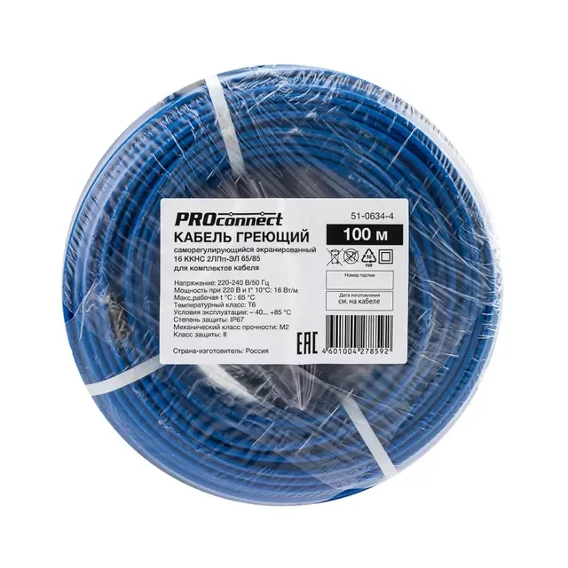 Саморегулирующийся греющий кабель 16 ККНС 2ЛПп-ЭЛ 65/85 PROconnect предназначен для защиты от замерзания бытовых трубопроводов, счетчиков воды, вентилей и т. п. Кабель является саморегулирующимся, и его теплоотдача зависит от окружающей среды. В нормальных условиях его температура не превышает 65 °С. Монтируется на поверхность как металлической, так и пластиковой трубы. Может быть установлен внутрь трубы с водой и под теплоизоляцией. При монтаже провод может пересекаться сам с собой. Сечение токопроводящих жил: 0,5 мм2. Диаметр токопроводящих жил: 0,9 мм. Максимальная длина секции: 115 м. Коэф. пускового тока: 4,6. Материал токопроводящих жил: луженая медная проволока. Экранирование: да. Минимальная температура монтажа: -30°С. Температурный класс: Т6.