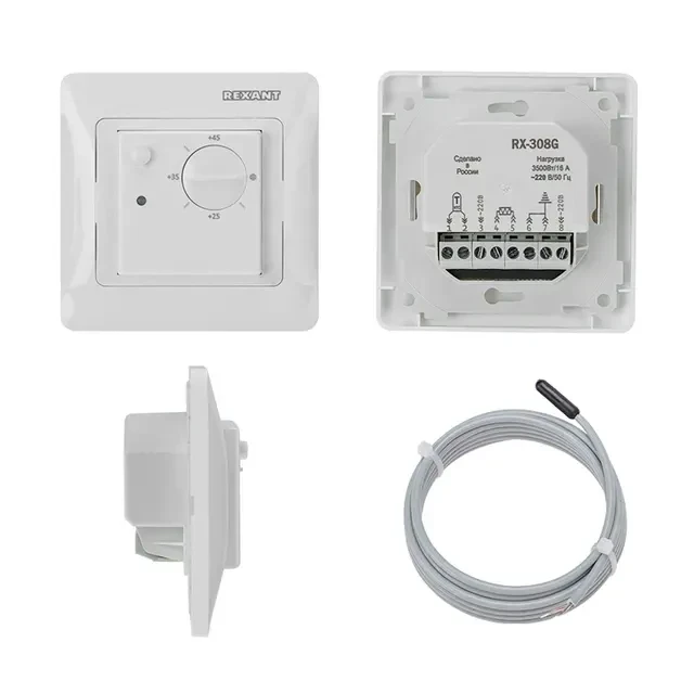 Механический термостат RX-308B от REXANT белого цвета обеспечивает регулировку температуры в диапазоне от +15°C до +45°C. Имеет высокую коммутационную способность контактов до 16 А (3500 Вт), что позволяет использовать его для управления большим количеством электроприборов. Одним из преимуществ механического термостата является наличие внешнего датчика температуры с сопротивлением 10 кОм. Это позволяет точнее контролировать температуру в помещении и обеспечить комфортную атмосферу. Термостат RX-308B подходит для использования в различных областях, включая домашнее и офисное применение. Легко устанавливается и прост в использовании. Терморегулятор совместим с электроустановочными средствами Schneider серии Glossa, Atlas, Sedna, W59.