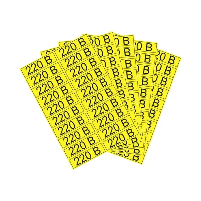 Знак электробезопасности (наклейка) «220 В» – это информационный знак, который сообщает о напряжении в электрической сети. Предназначен для размещения около розеток и выключателей. Наклейка используется для предупреждения и информирования окружающих, а также для организации мест работы электромонтажных бригад. Наносится на ровную сухую поверхность. Знак выполнен из прочного износостойкого материала, благодаря чему устойчив к воздействию прямых солнечных лучей, перепадам температур и мелким механическим воздействиям. Знак хорошо виден на любой поверхности, легко клеится, крепко держится и не оставляет следов после снятия. Комплект набора: 100 наклеек размером 15х50мм (5 листов, по 20 наклеек на каждом).