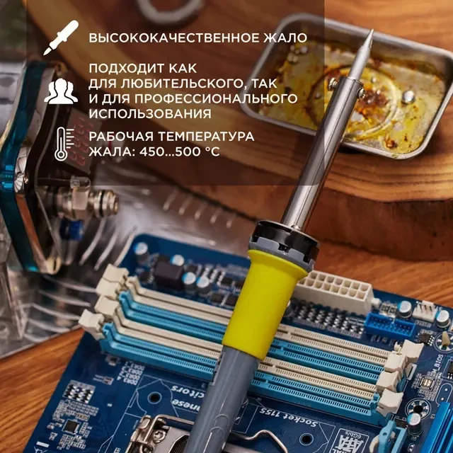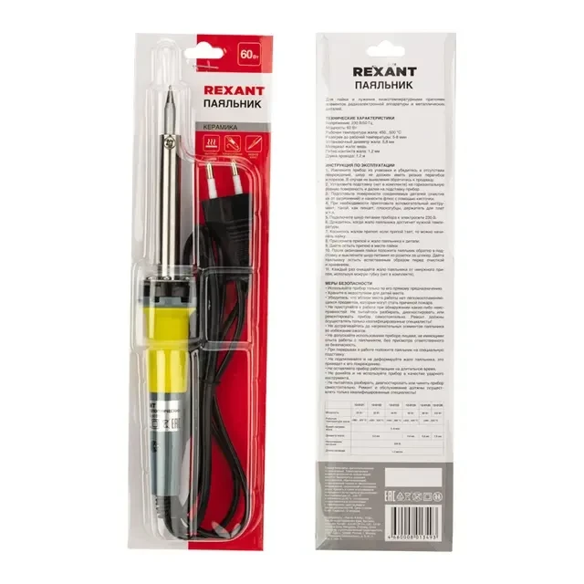 Паяльник с долговечным жалом мощностью 60Вт REXANT предназначен для ручного монтажа/демонтажа электронных компонентов и других деталей среднего размера. Подходит как для любительского, так и для профессионального использования. Долговечное жало паяльника состоит из медьсодержащего сердечника, покрытого слоем электролитически осажденного железа, отличающегося высокой стойкостью к коррозии. При соблюдении ряда предосторожностей жало способно работать длительное время без утраты эксплуатационных свойств, а в случае необходимости его можно легко и быстро заменить (сменное жало в комплект не входит). Нагреватель имеет керамическую трубку, которая повысит энергоэффективность прибора. Паяльник оснащен ударопрочной рукояткой из термостойкого пластика с резиновой накладкой, которая сделает работу с инструментом легкой и приятной.