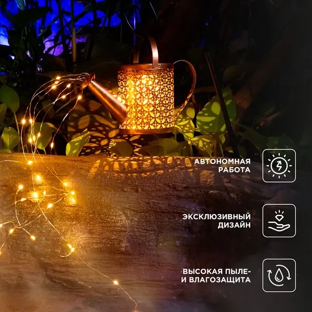 Грунтовый светильник Лейка – это не только источник освещения, но и декоративный элемент, который превращает ваш сад в волшебное пространство, наполняя его нежной атмосферой и загадочным сиянием. Светильник выполнен в форме Лейки, из носика которой струится гирлянда роса, создавая эффект светящихся падающих капель. Светильник оснащен солнечной панелью, которая поглощает солнечные лучи в течение дня и преобразует их в электрическую энергию. Накопленная энергия хранится во встроенном аккумуляторе, что позволяет светильнику автономно функционировать около 6-8 часов и освещать окружающую территорию вечером и ночью, не требуя подключения к электросети. Дизайн светильника вдохновлен богатой историей и культурой Стамбула, что привнесет в ваш сад нотки восточной элегантности и утонченности.